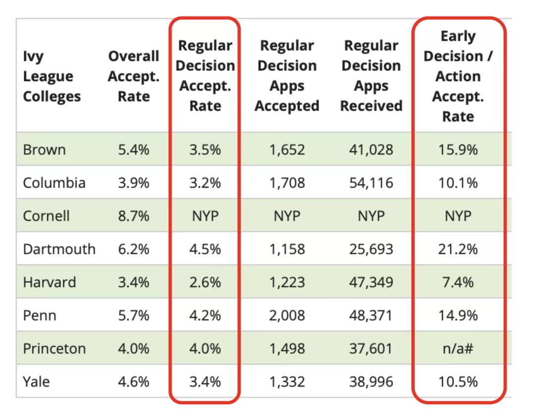 那么世界级顶级名校常春藤的常规录取和早期录取对比又是什么样的呢?
