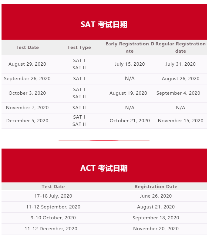 在疫情期间,除了导致签证收紧和政策不明朗,而学生和家长们最关心的美国大学标准化考试(SAT/ACT)也受到了冲击。因为无法在疫情期间举行标准化考试,SAT取消了3月份和5月份的考试;ACT也延期了6月份的考试。KEY也替各位整理出了,目前暂定开放的SAT和ACT考试如下: