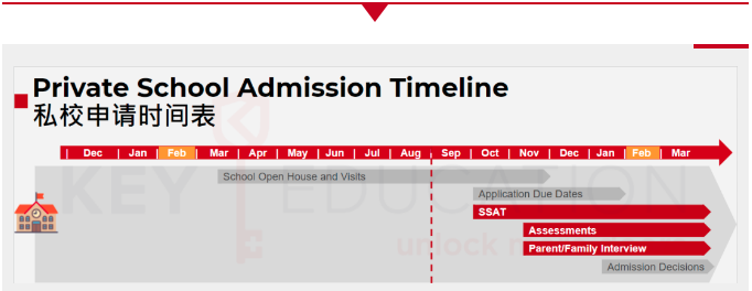 通常私校申请的流程节点大致上为:3月-11月参加校园参观(Open House)、9月学校开放线上申请系统、接着在10月至1月截止申请(Deadline),并且依照学校要求期限内缴交SSAT成绩(G4以上申请者,依学校要求而不同),并在11月中至3月举办入学测评(Assessment)与面试(Interview),最后就是等待申请结果。