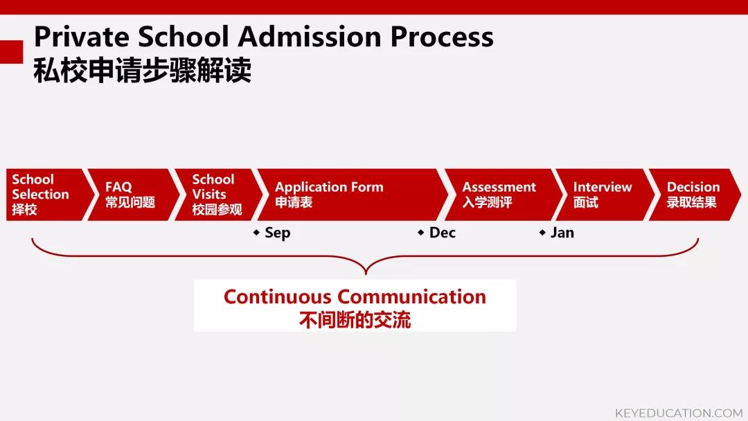 从上图可以看出,申请的步骤并不复杂。然而,看似简单的申请流程中隐藏着种种细节,在申请中全力以赴,精心打磨每个细节的家庭更容易受到私校的青睐。反之,如果家长们掉以轻心,除了错过展现自我的机会外,更有可能踏入私校申请的误区中。而申请的环节都是环环相扣的,每个环节的问题都可能会影响最终的申请结果。