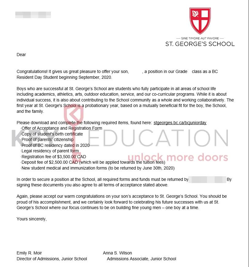 在实际经历一轮的私校申请后,我才意识到原来准备的工作是如此的繁琐且耗时。现在回头一看,幸好早在中国时就开始行动,才能够把握时间及早开始为私校申请做准备。特别要感谢KEY团队每个成员的尽心协助,由于我们对整个流程的不熟悉,加上新移民来到加拿大,时常有許多的困惑与焦虑,但每次与客服经理及顾问沟通后,都能得到一個令我们安心的答复,使我们对于私校申请更加有信心,能有方向性地推進准备工作。最令人惊喜的是原本已经做好要申请两年的准备,竟然意外的在第一年就开花结果,能够在移民的第一年就成功拿到私校的Offer,真的非常庆幸最初找上KEY这样专业且令人信赖的机构。