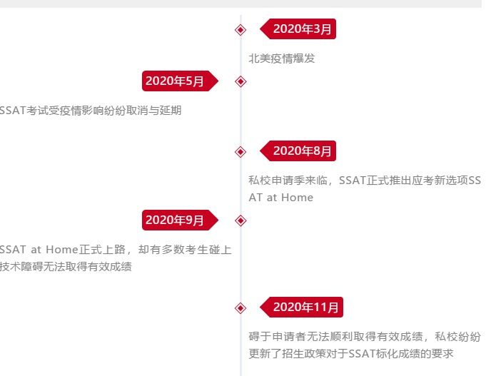 在今天的文章开头,我们将通过时间线来替各位家长回顾一下过去一年中SSAT标化考试发生了那些事,而私校的招生政策又是如何受到影响的。