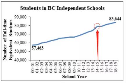 由上图可见从2001年至2019年私校就读人数不断地上升,特别是在2015年BC省出现长达半年的公校教师罢工后出现了大批的家庭转向私校的教育,类似的情形也在2020年出现,由于疫情造成校园关闭与学习中断,公校碍于有较大的群体需要顾及因此出现自主学习的空窗期,相较私校注重学术能力的发展加上目标一致的家长支持,使私校可以迅速进行线上课程转衔。因此不管是新移民还是本地家庭,只要是注重孩子教育发展的家庭都会在规划教育时把私校列入选项考量。