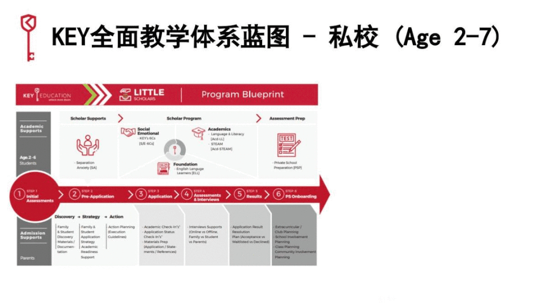 教育是场漫长的旅程,过程中每间学校所起到的作用就是更好的为孩子预备下一段的旅程,成功获得私校录取并不是旅途的终点,而是下一个阶段新的开始。 KEY一站式教育规划服务囊括了从学前教育规划到私校申请,再到本科以及研究生的申请,这些学校横跨了北美、欧洲与亚洲,使我们的顾问团队在初次与家庭合作的时候就可以有更宏观的视野,为家庭量身打造出一套专属的长线教育规划里程碑。通过KEY十年来替上千家庭规划的经验,打造出了一套全面的教学体系蓝图,针对从2.5岁到18岁以上不同年龄段的学生,有方向性的打造申请者个人特色与档案发展计划,并且持续灌溉孩子的热情项目与衔接学术成就发展,以达成家庭对于孩子每个阶段的求学期待。