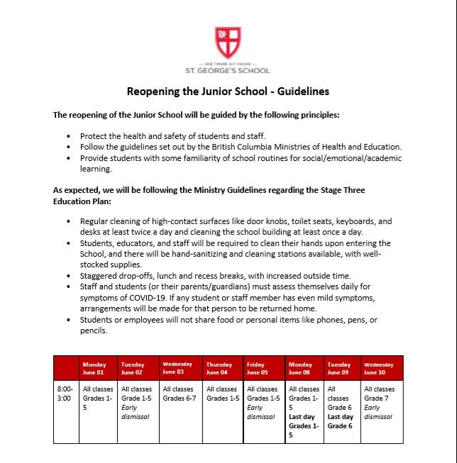 为了能够正式的重新开学,每间学校也都正在努力拟定"安全营运计划"确保在开学后可以是当的疏散人流,让学生可以在健康不受威胁之下持续学习,而大温地区的私校如St. George's School也在5月15日省长宣布校园开放后,随即宣布了校园重启声明并且在官网上放上了详细的校园重启计划书,私校的反应速度实在令人敬佩,有兴趣了解更多的家长也欢迎到St. George's School的官方网站查看更多资讯。