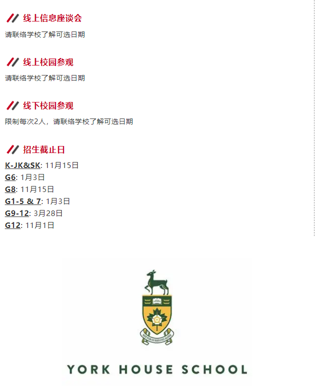 于此同时,部分私校如York House School和Mulgrave都重新启用了线下校园参观。申请家庭可在学校代表的带领下进入校园、感受学习氛围、参观教学设施并与招生人员交流对谈。然而,出于安全考量,私校对于校园参观的人数有着严格的要求,名额有限,有需求的家长建议您立刻前往学校官网预约。